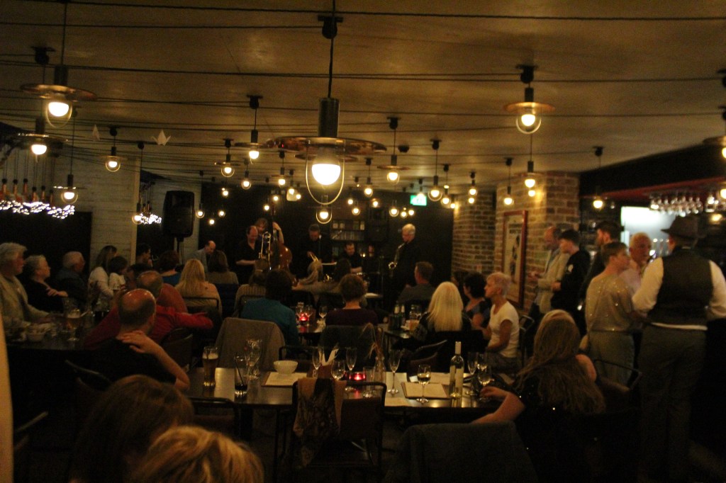 The house band, Stan Williams (trumpet), John Padfield (sax, clarinet, flute), Andrew MacKenzie (trombone/vocal), David Fishel (piano, vocal), Grant Russell (bass), Ed Hannaby (drums, vocal) played with special guests intermittently entering throughout a night of swing, bebop and cool Jazz. Blues songs were also played. Guest performer Cian Radcliffe who has played Saxophone for just 4 years wowed crowds with just as equally virtuoso a performance as the house band.