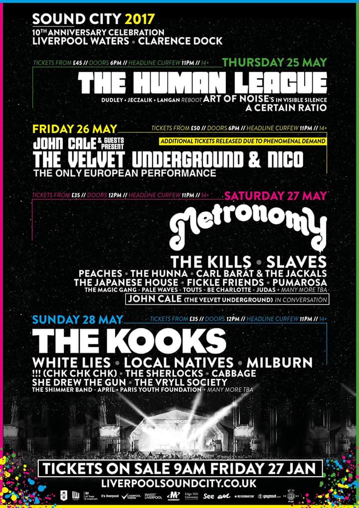 This year’s festival will run over four days at the new location Clarence Docks and will feature the best bill of the festival’s lifetime. Headliners include The Human League (Thursday), John Cale (Friday), Metronomy (Saturday) and The Kooks (Sunday).