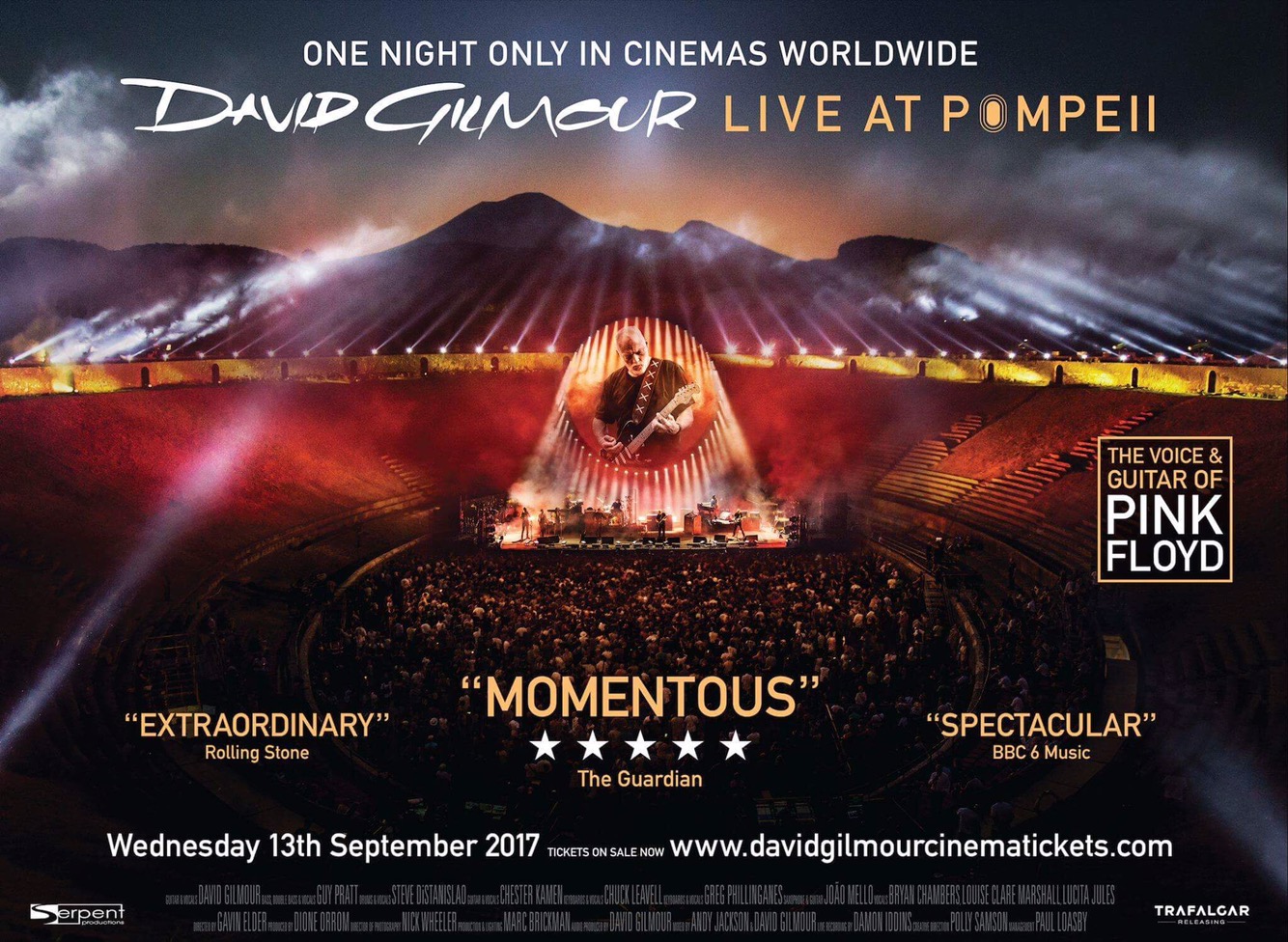 On the 13th September 2017, cinemas around the UK and many more around the world hosted the only cinematic performance of Dave Gilmour: Live in Pompeii, the film of a concert by the legendary Pink Floyd guitarist and his band, which took place in the ancient amphitheatre of Pompeii on the 7th July 2016.