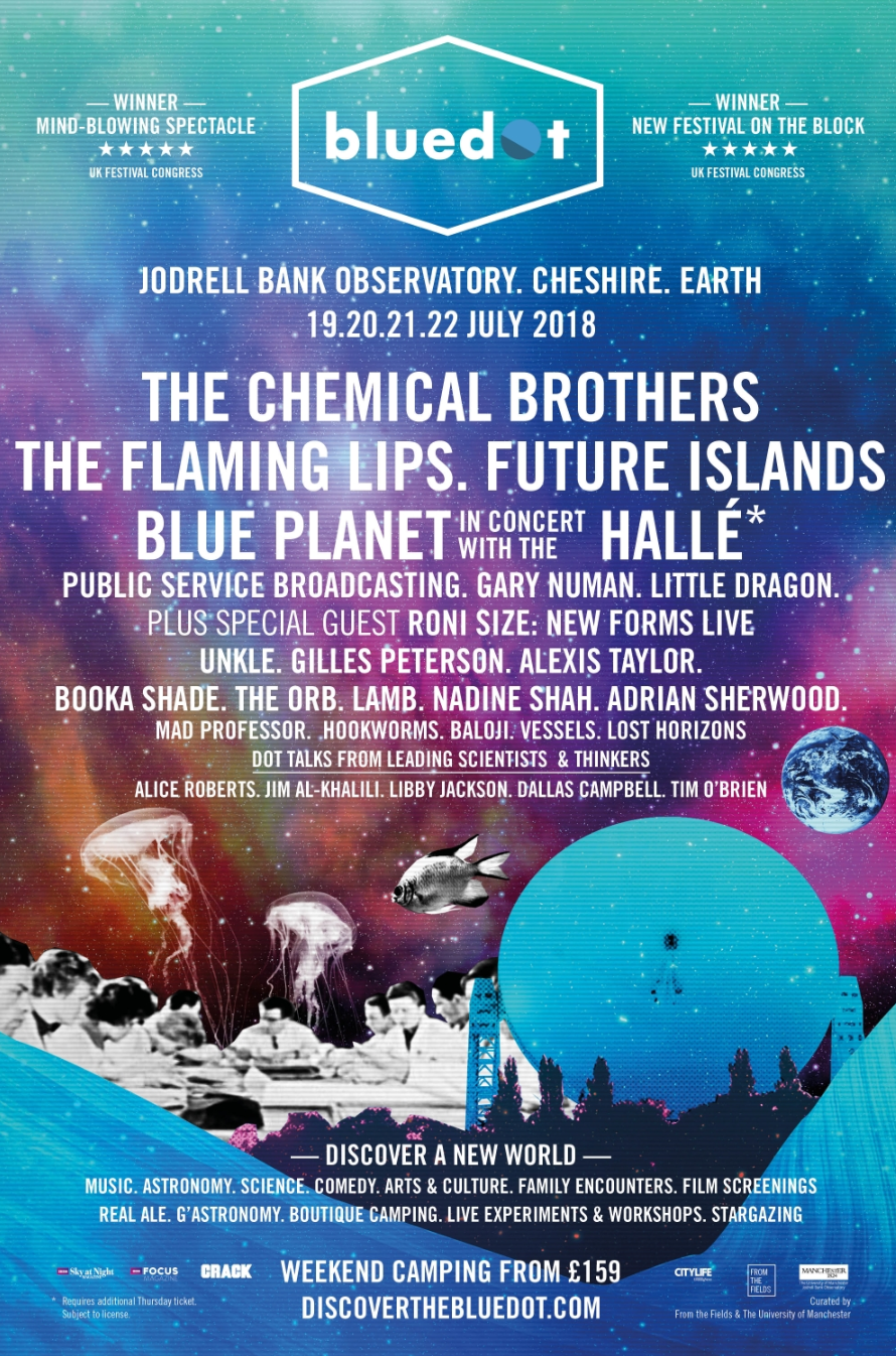 Headlined by The Chemical Brothers, The Flaming Lips, Future Islands and Blue Planet in Concert with The Halle, this year’s festival of intergalactic proportions takes over Jodrell Bank Observatory for four days of programming.