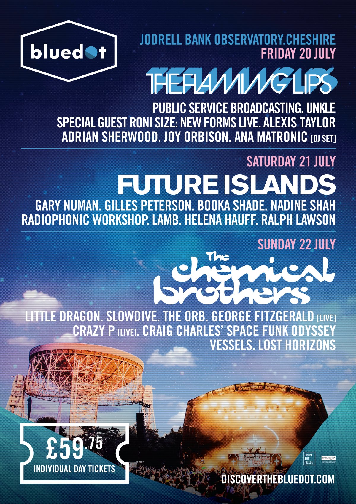 Sounds From Nowhere‘s favourite festival of the year, Cheshire‘s Bluedot Festival, have announced their day splits for this year’s weekend.