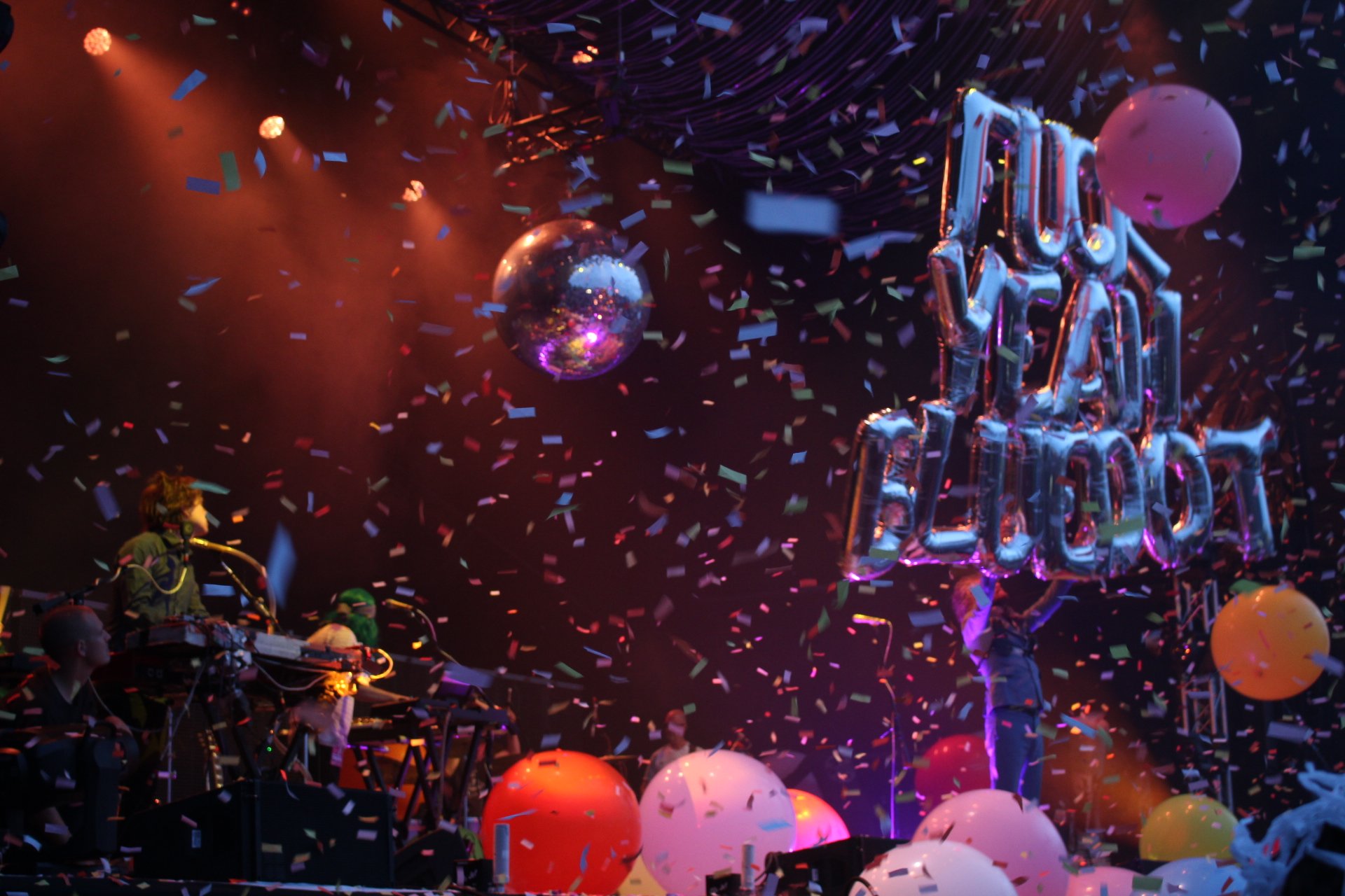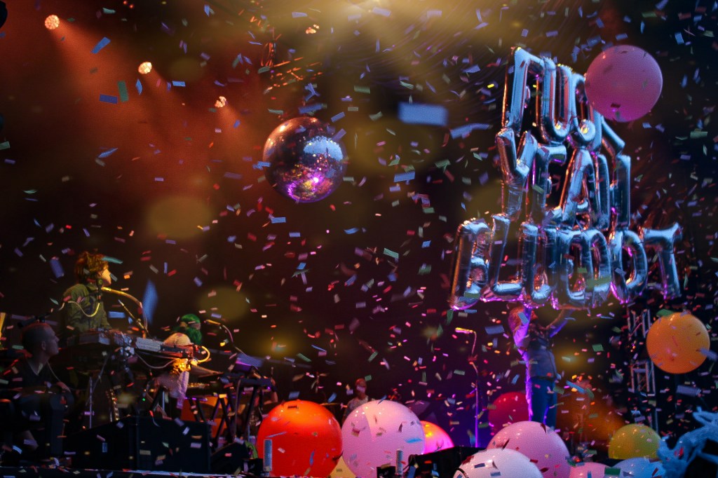 The Flaming Lips enter to frontman Wayne Coyne telling us that he’s sorry for the wait, and that the show will start now. The band slowly preform Richard Stauss‘ signature “Also sprach Zarathustra, Op. 30” moments before confetti flies from every angle into “Race For The Prize“.