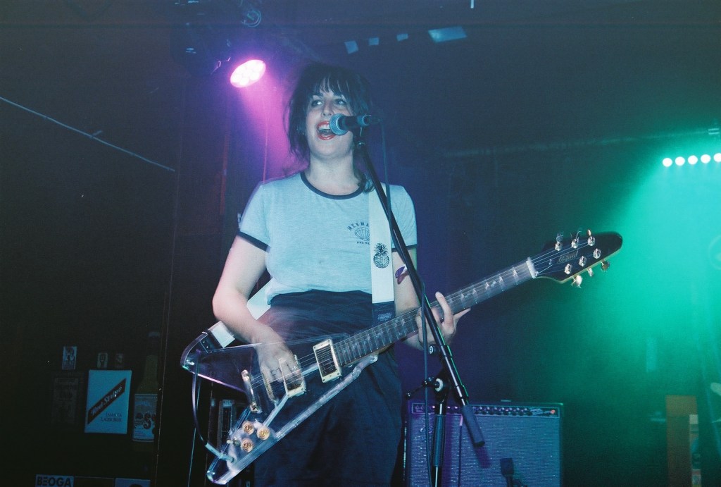 Sharkmuffin make their onto the stage and rip into their insanely catchy, high-octane noise-pop with songs rarely breaking the two-minute mark. Grungy, fuzzy and angular, Sharkmuffin feel like the natural successors from the Riot Grrrl scene of the 1990s, meshed with the grimy lo-fi disco-pop of the likes of Yeah Yeah Yeahs, Tarra Thiessen’s vocals channelling Karen O and Kathleen Hanna simultaneously through a mix of singing, shouting and screaming, backed up by tight harmonies from her bandmates, Natalie Kirch and Jordyn Blakely.