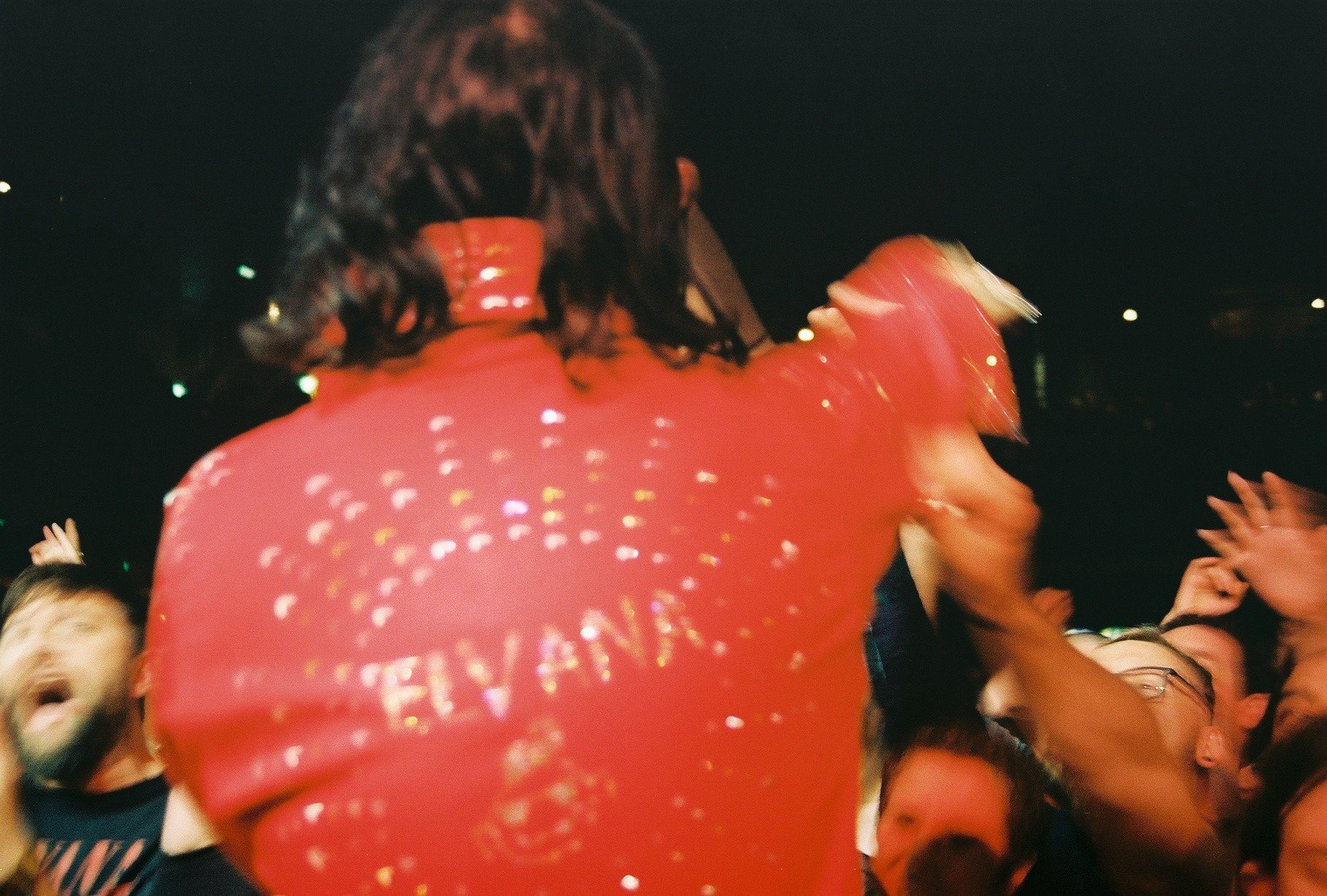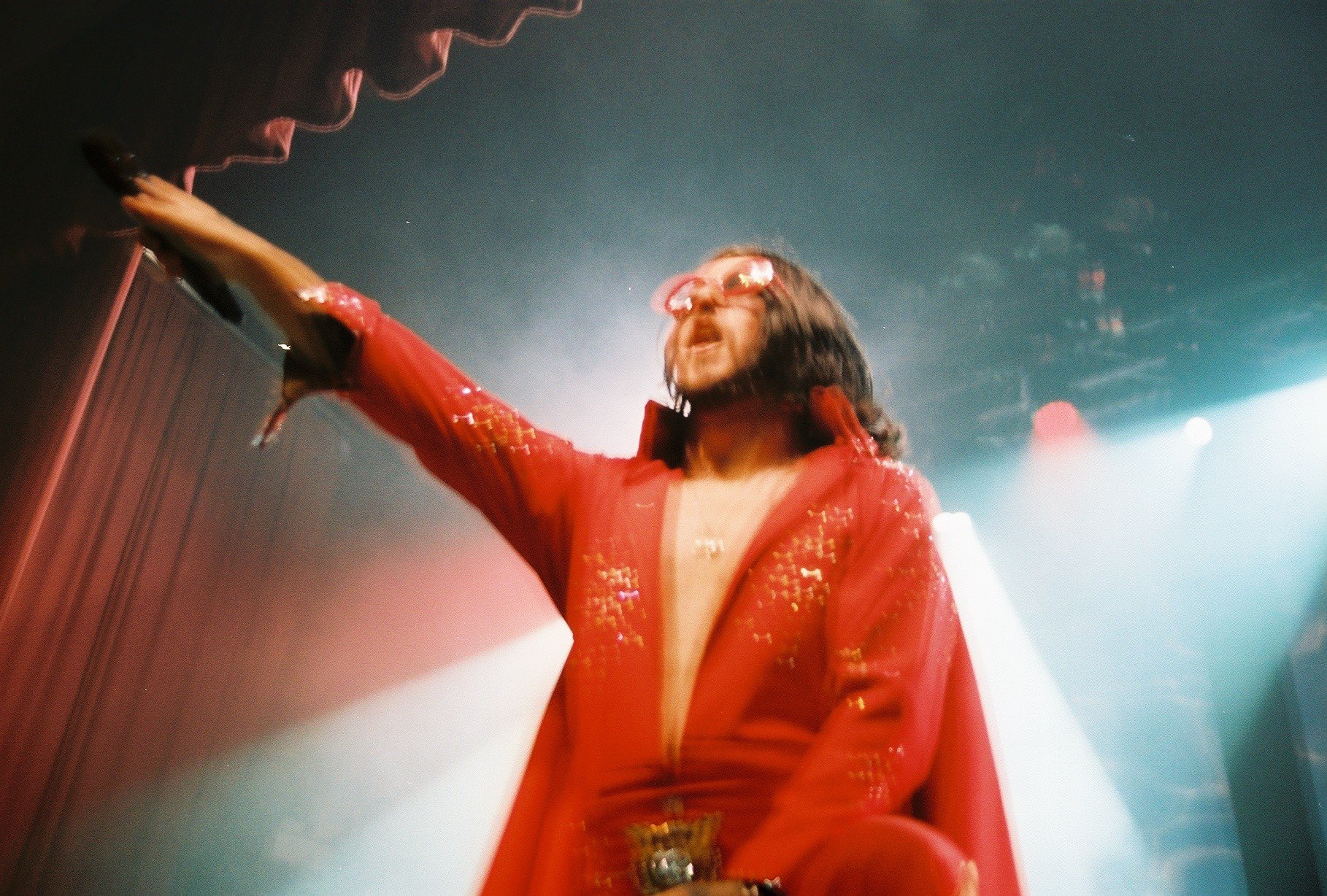 “There’s times where I sound like I’m Nicholas Cage. There’s other times where I sound more like Matthew McConaughey- alright alright alright…but there’s times where I’m gonna be sounding like The King, and a lotta times where I’m gonna sound like Kurt Cobain“- this might an effect of the time travel that has allowed Elvana to have their frontman alive and well in the 21st century at the peak of his powers, shaking and shimmying his way across the stage, peppering songs with kung-fu movements following a quick costume change and interlude (the aforementioned “Molly’s Lips” played just by the backing band) that allows an appearance of the incredibly famous white jumpsuit with rhinestone eagle design. Presley has the sold-out crowd in the palm of his hand as he leaves the stage to haul himself onto the security barrier for a intimate interaction with his audience, his appeal just as strong now- if perhaps a little more seedy and surly- than in his Ed Sullivan show days. In terms of content, the set list is far more Nirvana-based, with only teases and snippets of Elvis‘ material surfacing mid-song, or as an intro or outro.