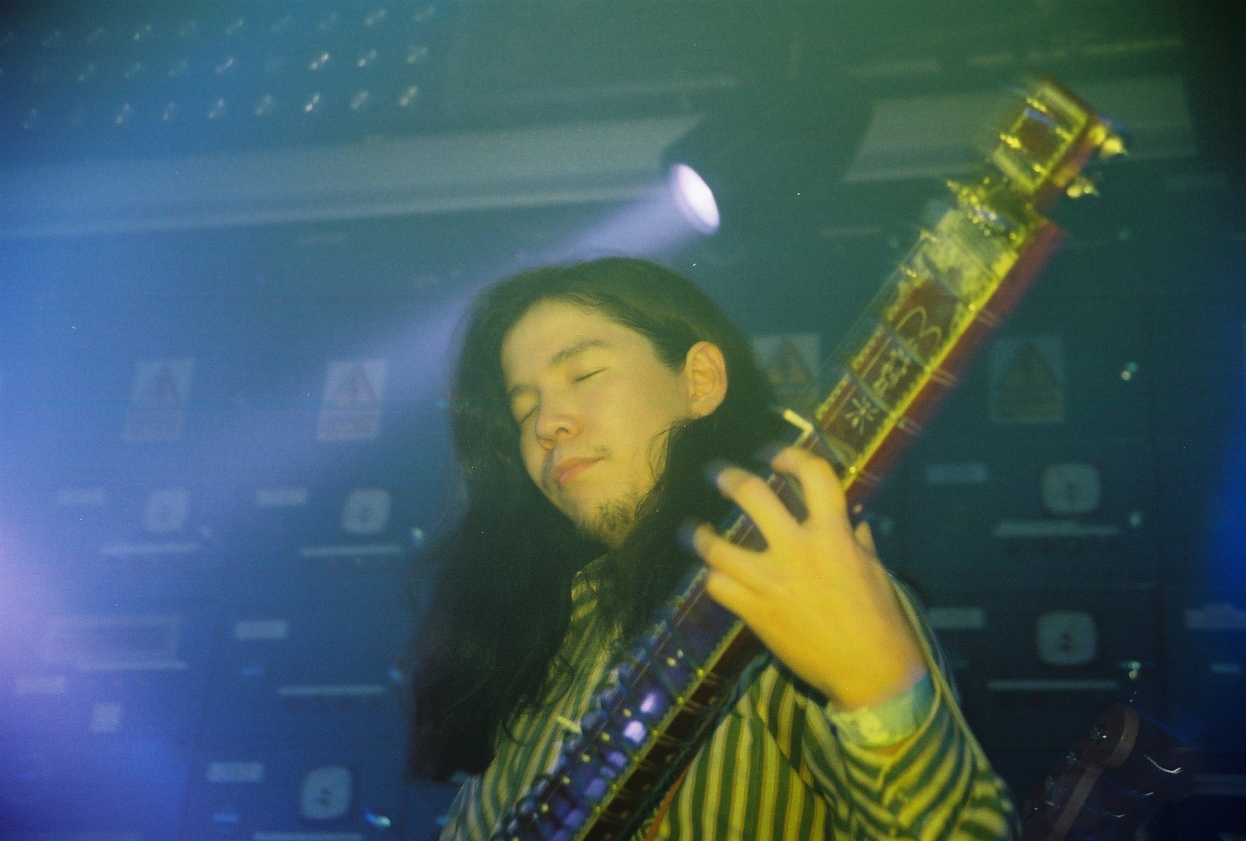 Caressed by a cloak of bright blue light and hidden behind thick smoke, Kikagaku Moyo start slowly, a mellow raga played on the sitar building in complexity as the twin guitars of Tomo Katsurada and Daoud Popal swirl into the fold as time seemingly slows down and third eyes open up. Extended jam sessions built on the trio of melody-makers playing off one another, but still as a collective, never feeling like a game of oneupmanship or an inter-band ego battle, while Kotsu Guy‘s rock-solid cylindrical basslines act as ballast to stop the five-piece taking off into the astral plane.