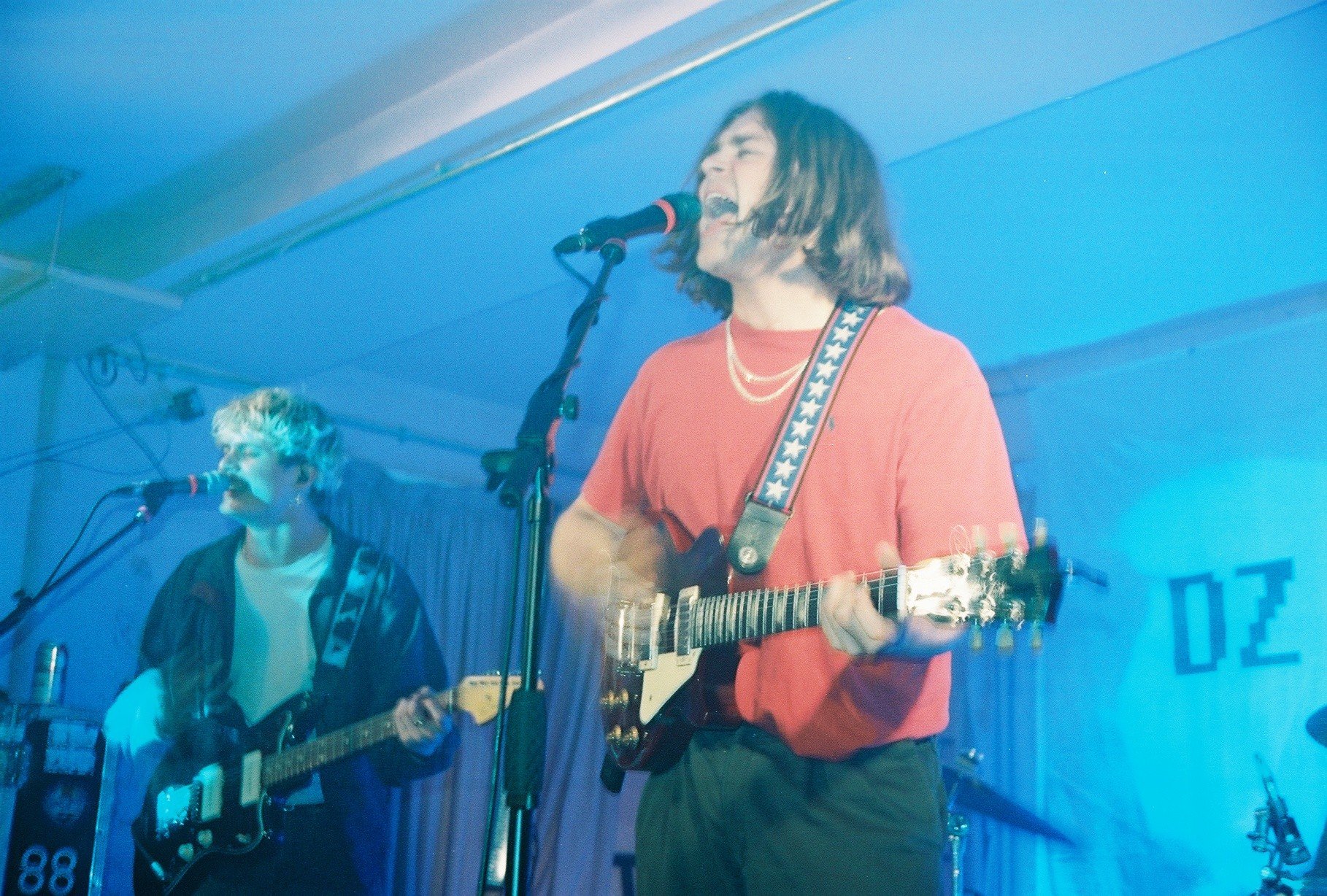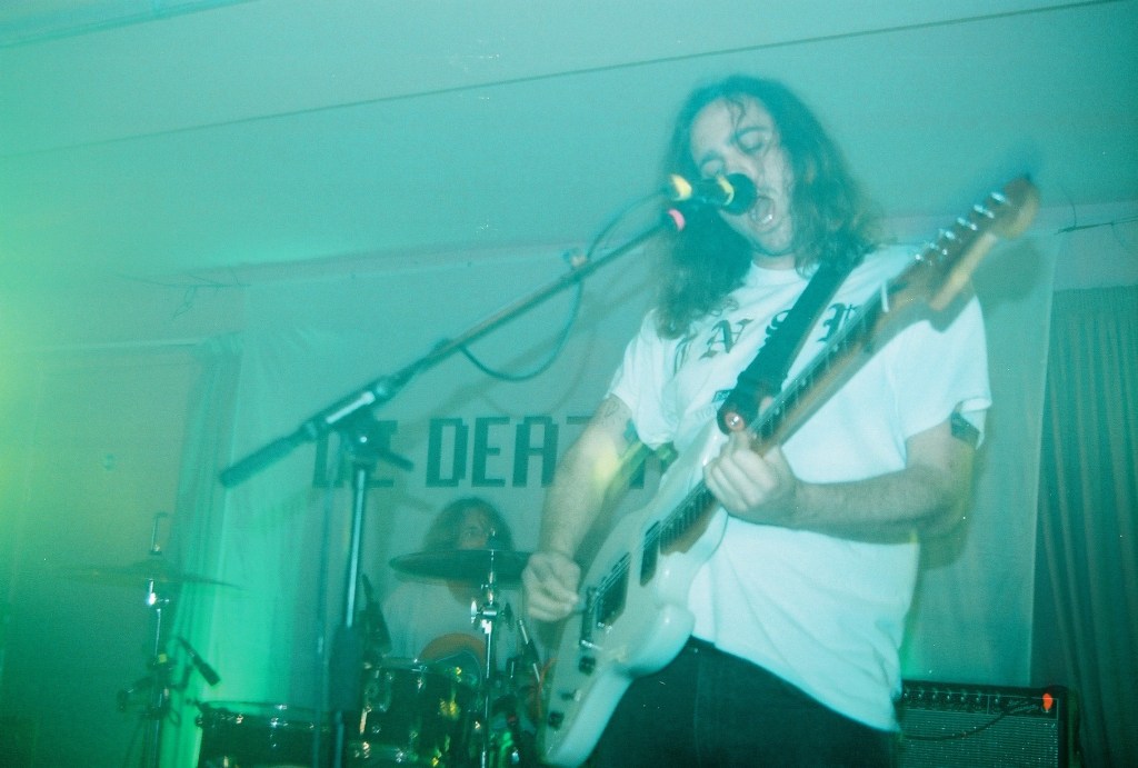 It takes 3 songs for the Pink Room to descend into absolute chaos- after droning, cinematic opener “Hi Everyone“, DZ Deathrays‘ bludgeoning mixture of post-hardcore and grimy dance-punk (with the slightest hint of surf rock thrown in), heavy but groovy with melodic chops hidden beneath: think 1989 Melvins waking up on the beach after a night on the VB longnecks- interlinked guitars (one downtuned, Sleater-Kinney style) offer a sound edging towards the heavier end of skate-punk at times when Shane Parsons and Lachlan Ewbank‘s close harmonies sit together above the adrenaline surge, the low-tuned sludge a soundtrack of bodies leaping across the room, a flesh-and-blood tidal wave crashing against the edge of the stage.