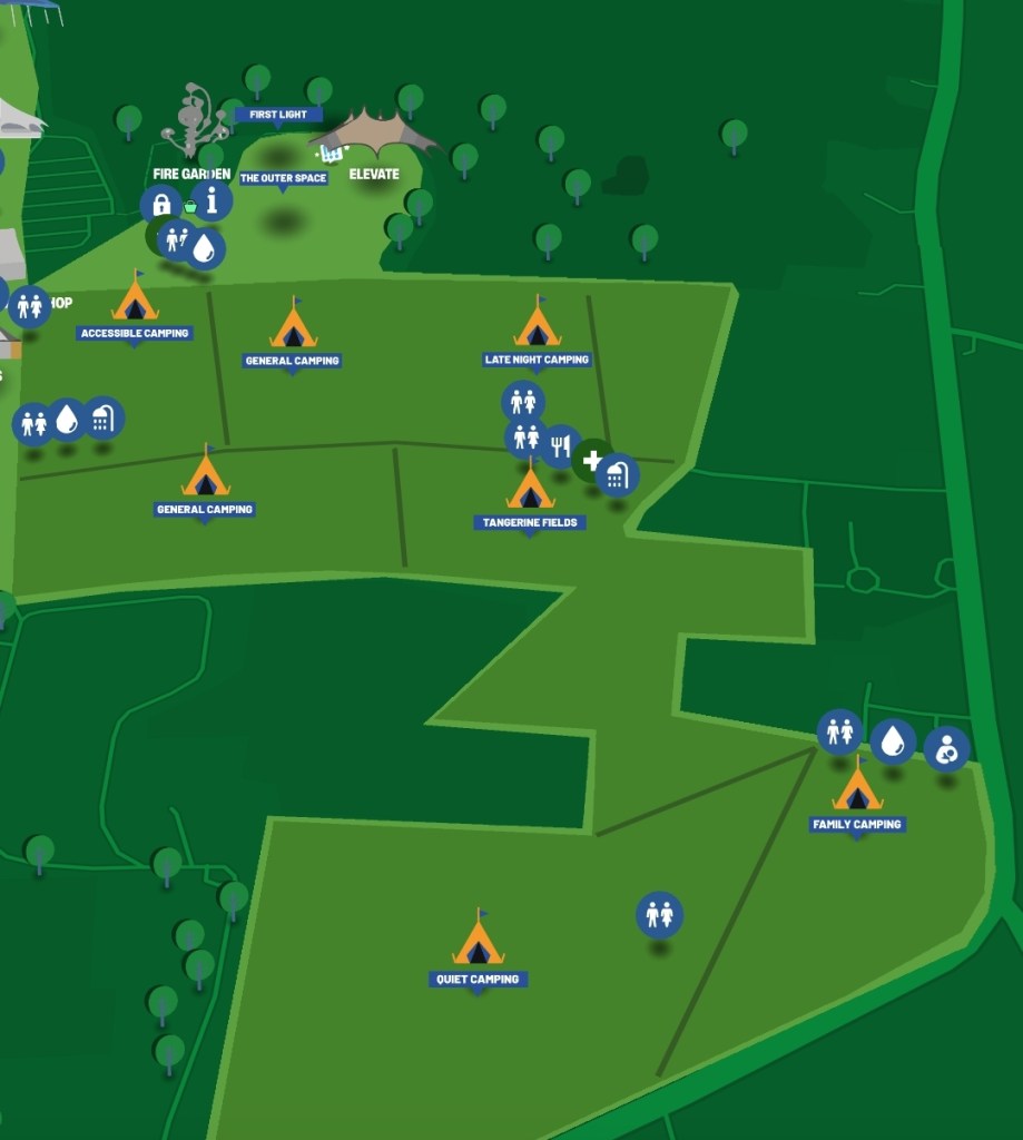 Either side of the General Camping area, we’ve got the Accessibility section (if you haven’t been accredited for that, it’s a no-go) and the other side has the Late Night Camping, for all you party people.