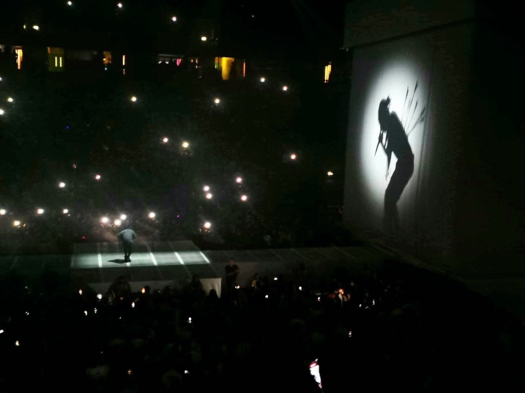 “Worldwide Steppers” follows with the lights reflecting Lamar‘s imposing figure onto the sheet-curtain behind, mismatching his live shadow with graphic shows around him, before diving right into good kid cut “Backseat Freestyle” that sounds gigantic.